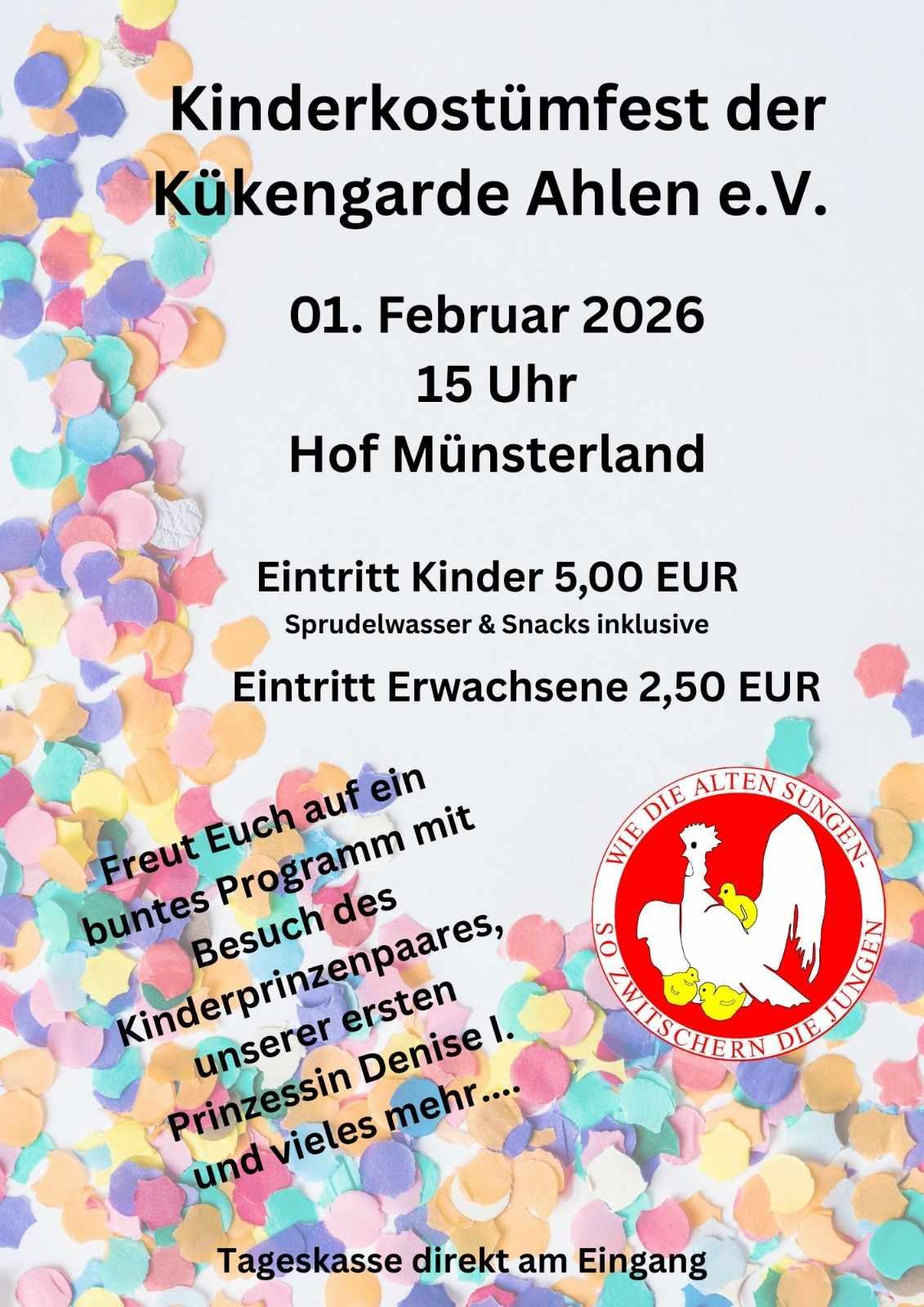 Am Sonntag, 1. Februar 2026, lädt die Kükengarde Ahlen e. V. alle Kinder und Familien zum fröhlichen Kinderkostümfest auf den Hof Münsterland ein. Bunte Kostüme, fröhliche Musik und ein familienfreundliches Programm machen diesen Nachmittag zu einem besonderen Erlebnis für große und kleine Karnevalsfreunde.